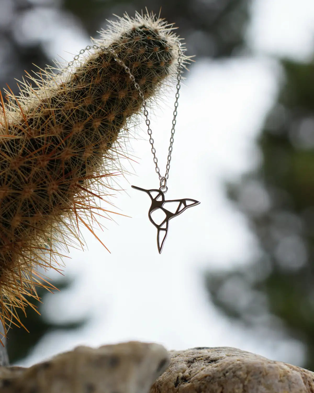 Elaborado en genuina Plata, el dije de colibrí presenta una silueta Origami o de "líneas rotas", lo que le da un aspecto moderno y aireado. La ausencia de relleno y el juego de espacios vacíos reflejan la luz de manera única. El dije cuelga de una cadena de eslabones finos de plata, ideal para llevarlo a diario.