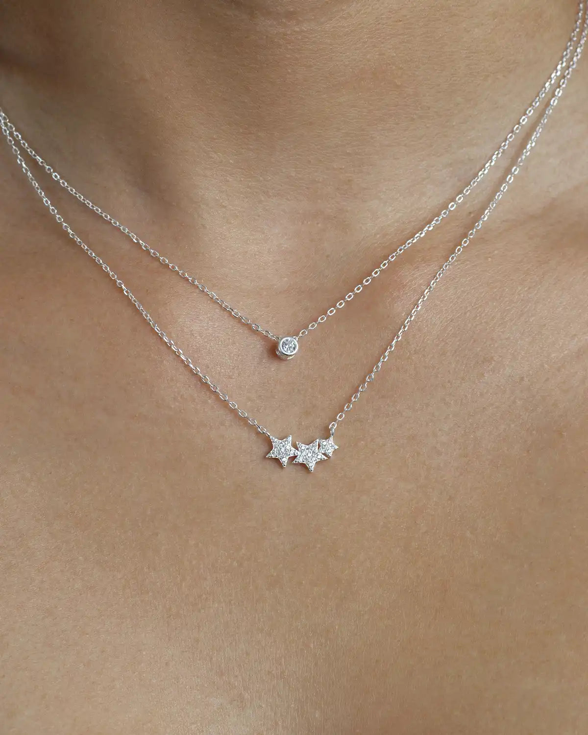 Elaborado en auténtica Plata, el collar presenta dos cadenas unidas por el mismo cierre. La capa superior es más corta y luce un dije de Circonia Solitario para un brillo pulido. La capa inferior, más larga, está adornada con un dúo de Estrellas de contorno y pavé de Circonia, inyectando ese toque juvenil de fantasía.