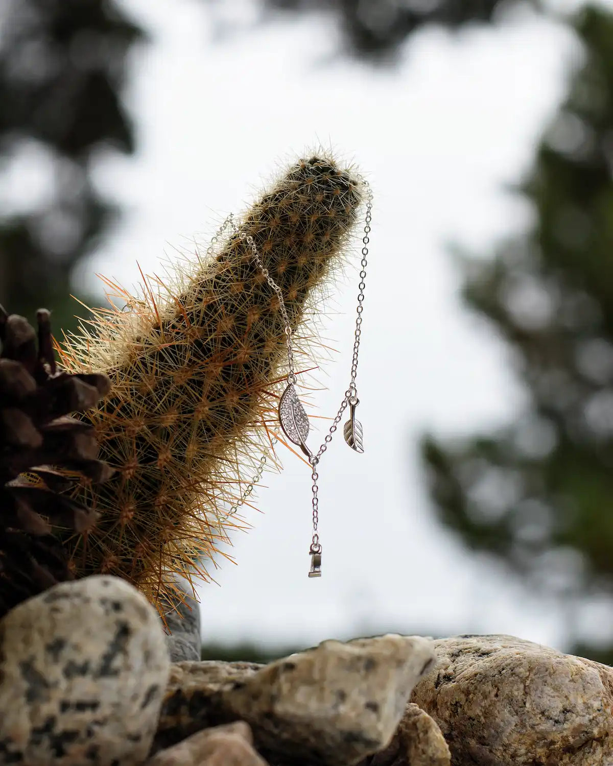 Elaborado en genuina Plata, el diseño es un delicado lazo. Presenta dos hojas: una hoja grande cubierta con pavé de Circonia Cúbica (brillo) y una hoja pequeña pulida y texturizada. El diseño culmina en una caída central que termina en una circonia con corte de gota, que agrega un movimiento constante.